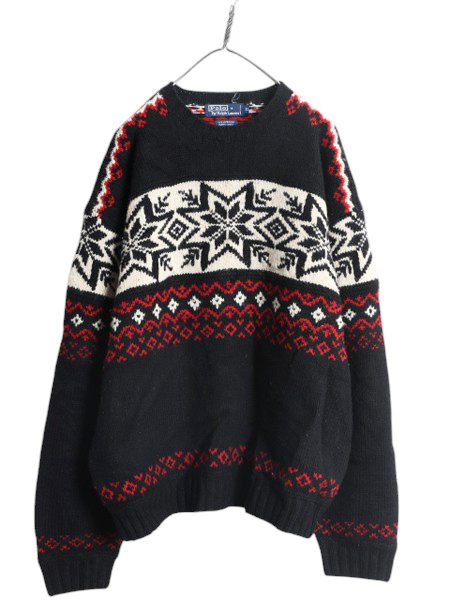 > 手編み 00s ポロ ラルフローレン ラム ウール ハンドニット セーター メンズ XL オールド ノルディック 総柄 ハンドメイド 大きいサイズ 黒