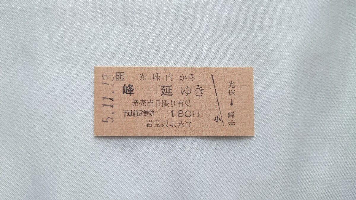 - △JR北海道・岩見沢駅発行△光珠内から峰延ゆき乗車券△B型硬券平成5年