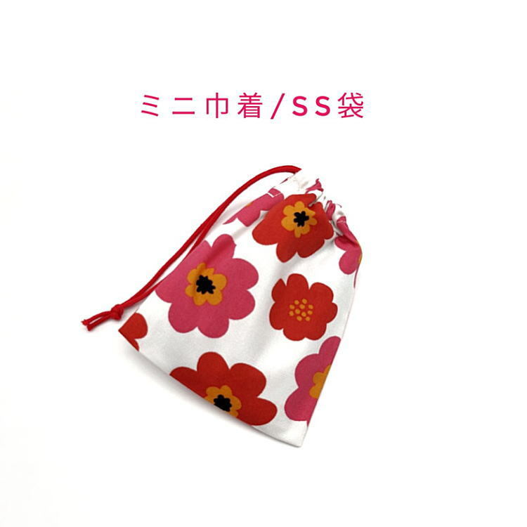 - ミニ巾着袋・SS袋【北欧風 ポップフラワー柄 ホワイト×レッド】マチ無し 巾着 ポーチ お菓子袋 小物入れ 小さい袋 プレゼント 花柄