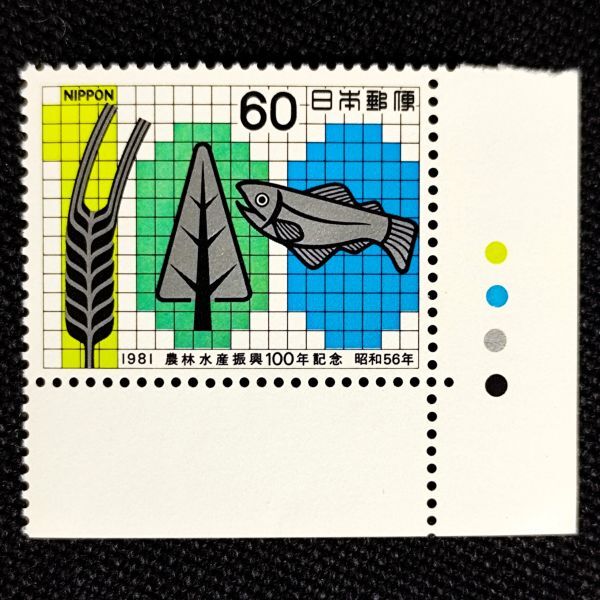 > [25012627]【農林水産振興100年記念】単片 CM・カラーマーク付「デザイン化した100に穀物 木と魚」60円 1981年発行 美品