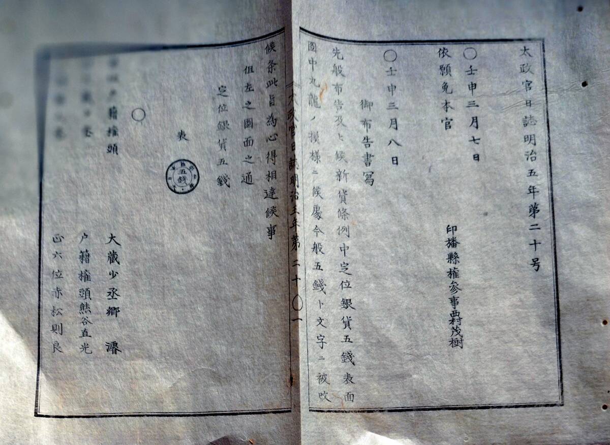 - f25012520〇太政官日誌 明治5年壬申 第20号〇銀貨5銭文字表示図面 西村茂樹免官 山縣有朋 西郷従道近衛 〇和本古書古文書