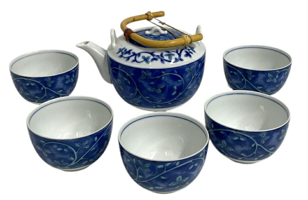 - 【新品未使用】 大吉窯 緑彩唐草 茶器揃 急須 湯呑 セット ヤマカ陶器 湯呑み 25ア224