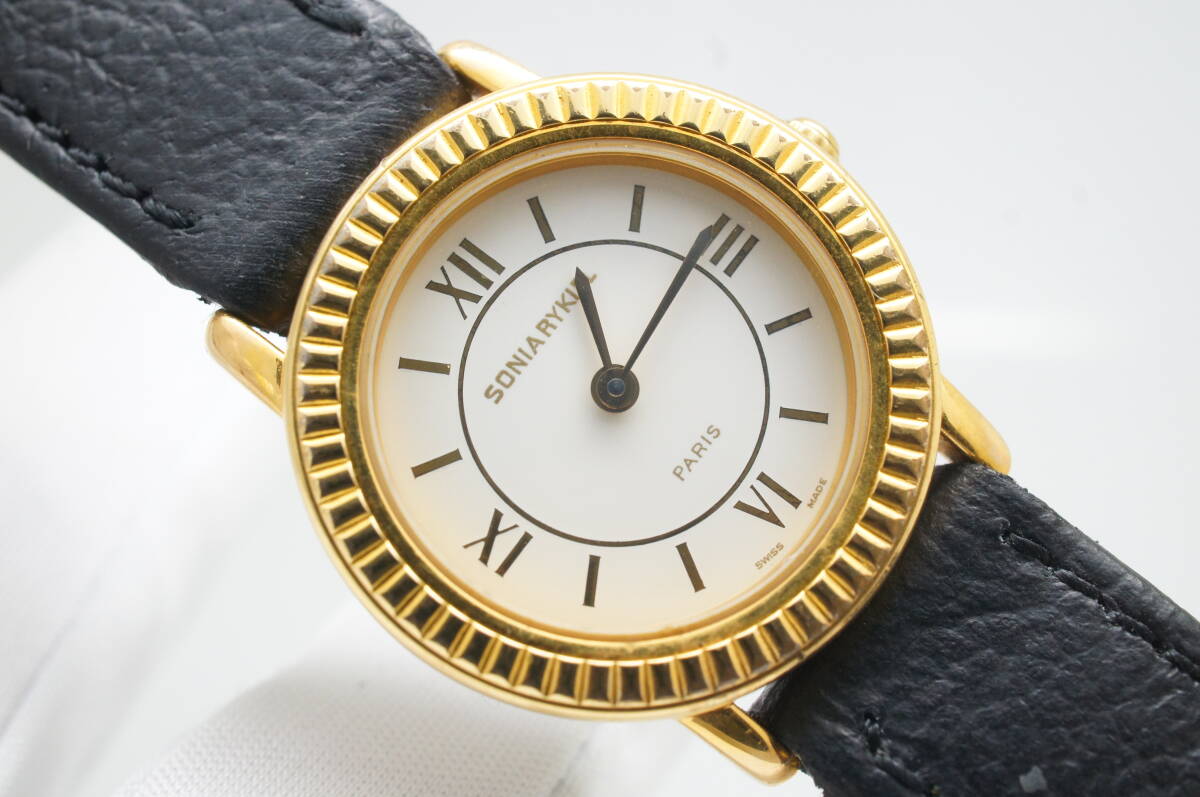 > A154●作動良好 未使用ベルト SONIA RYKIEL ソニアリキエル SWISS MADE 白文字盤 レディース腕時計 ゴールド金 お洒落 クォーツ