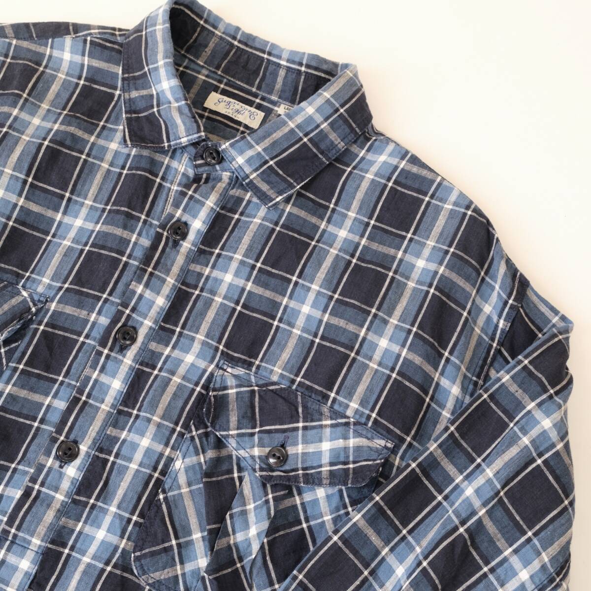 > 美品【 SUGAR CANE 】シュガーケーン リネン チェック プルオーバー 長袖シャツ / ネイビーブルーホワイト 紺青白 / L / 麻 light 日本製