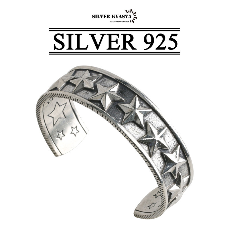 - シルバー925 スター バングル 星型 ブレスレット 燻し 加工 銀 幅18mm