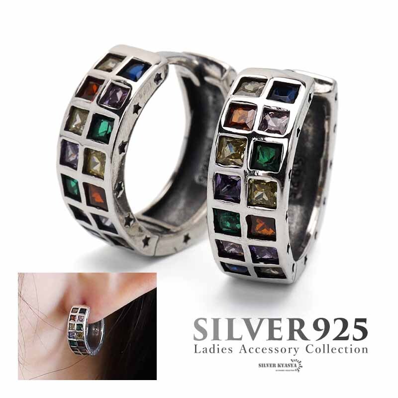 - シルバー925 フープピアス カラフル ストーン 大人可愛い スクエアストーンピアス 両耳 金属アレルギーフリー