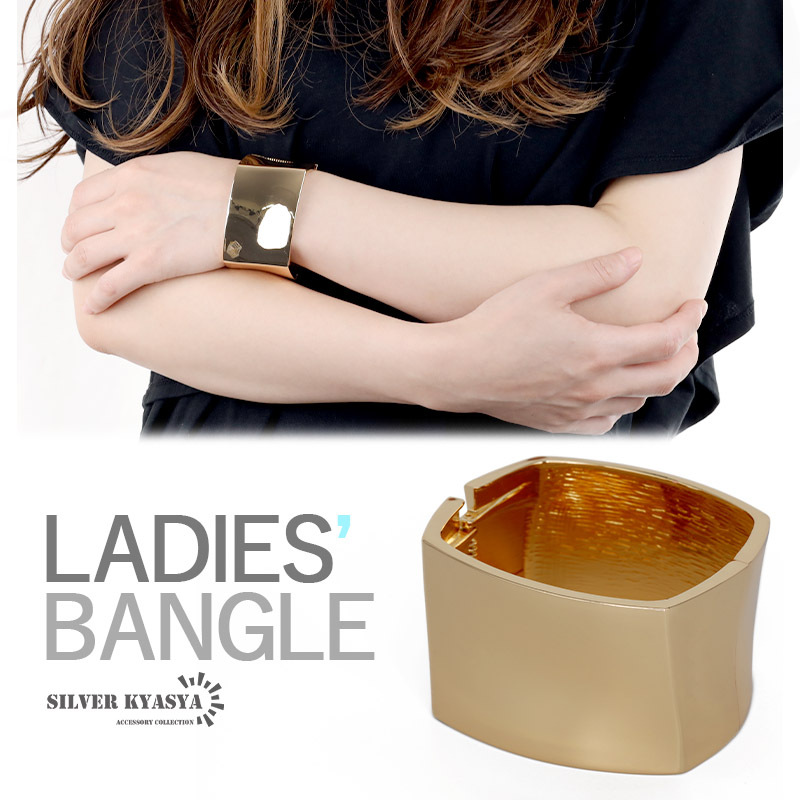 - スクエア ワイドバングル シンプルバングル 四角 太め 幅広 太めバングル 大ぶり ゴールド 開閉式 カジュアルバングル 腕輪 レディース