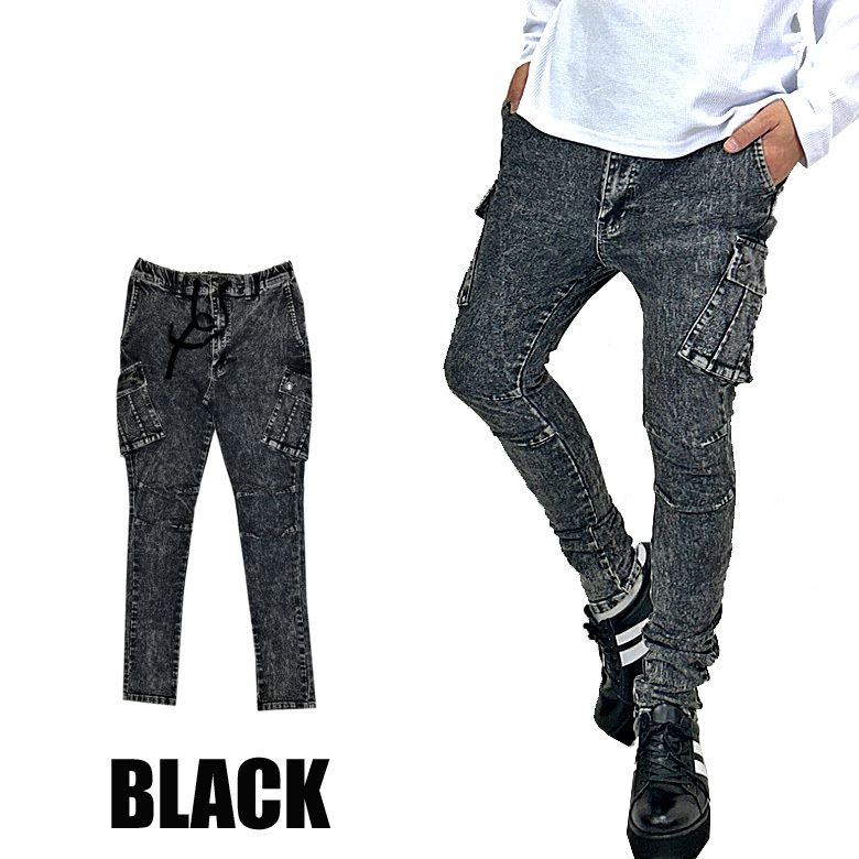 - ストレッチ スリム デニムカーゴパンツ 530-42llun 細身 ストレッチデニムパンツ カーゴデニム 新品 ブラック L