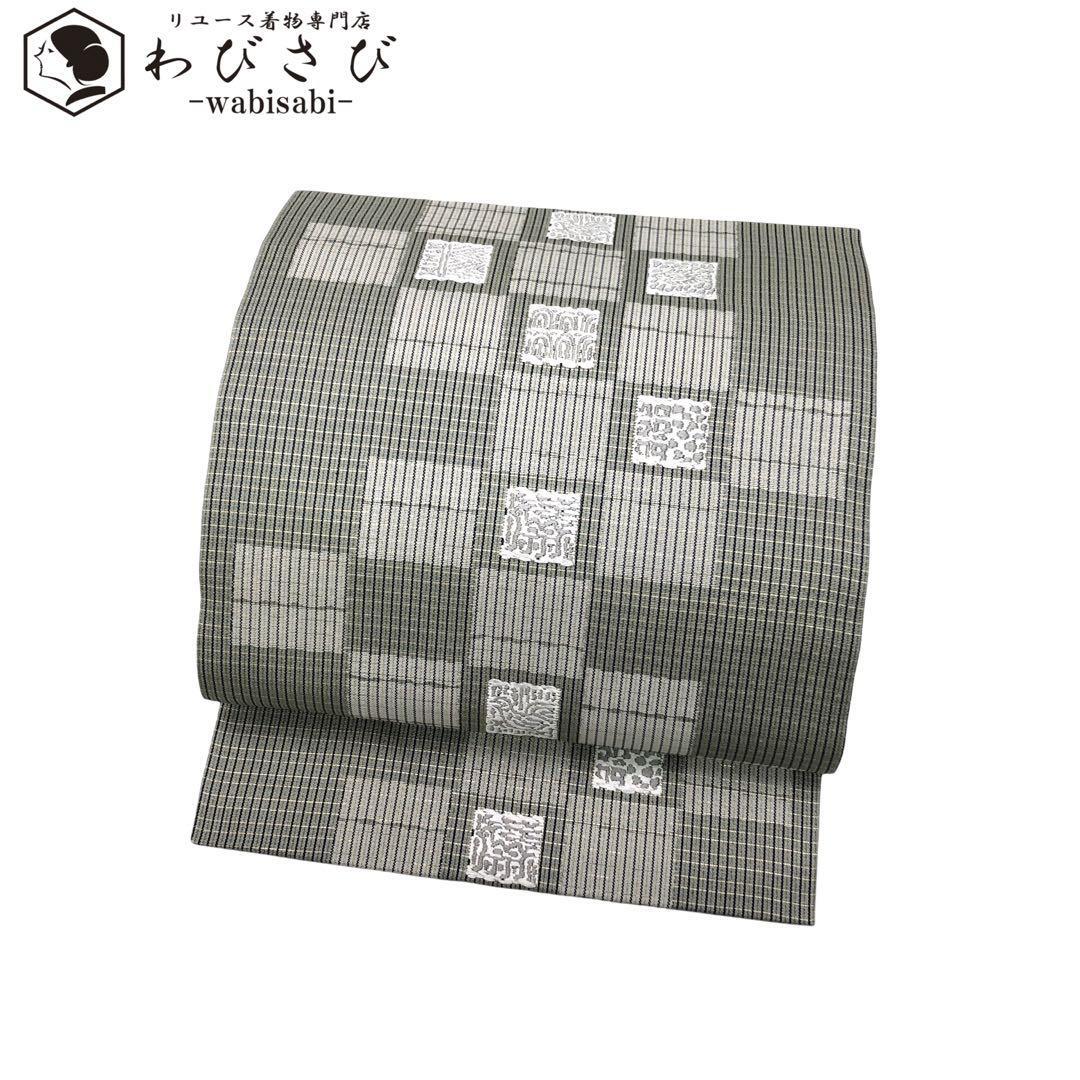 - 名古屋帯 格子柄 抽象織模様 灰緑色 O-4642 着物 きもの kimono 和服 和装 中古 リサイクル着物 【送料無料】