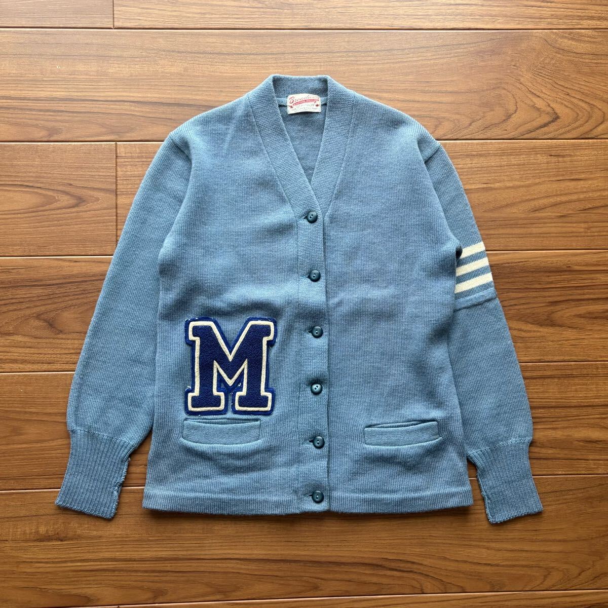 > 70s Broadway KNITTING MILLS INC. レタード カーデガン ニット Mサイズ ブルー vintage ワッペン USA 古着 ウール オリジナル