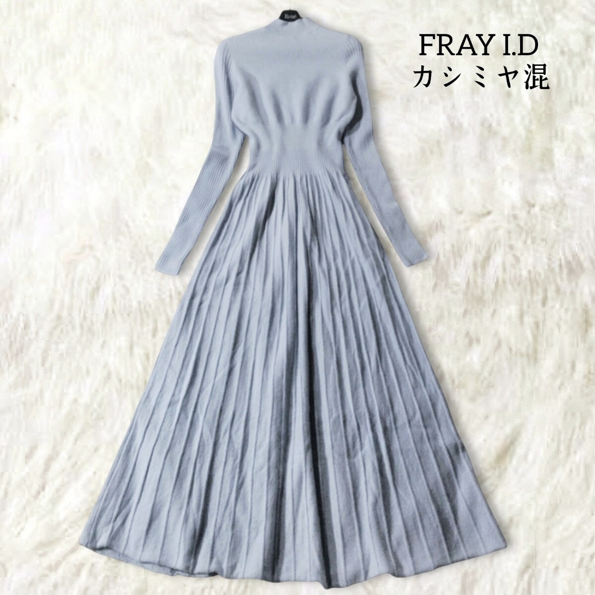 - 56 【FRAY ID】 フレイアイディー カシミヤ ニットワンピース ロングワンピース F くすみブルー ペチコート付き フレア ピンタック 長袖