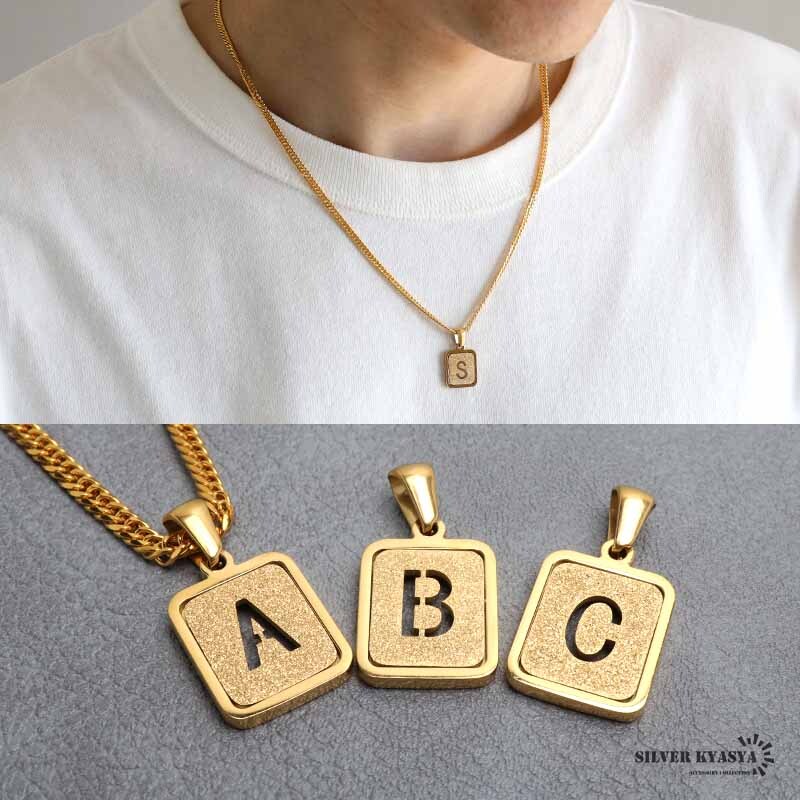 - (Y、50cm) イニシャルネックレス ゴールド グリッター スクエア ステンレス 18KGP ダブル喜平 金属アレルギー対応