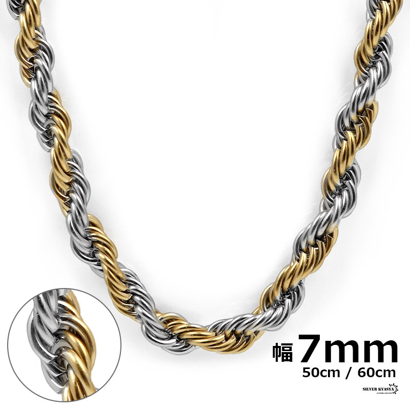 - (50cm) チェーンネックレス ロープチェーン 幅7mm ステンレス コンビチェーン シルバー ゴールド