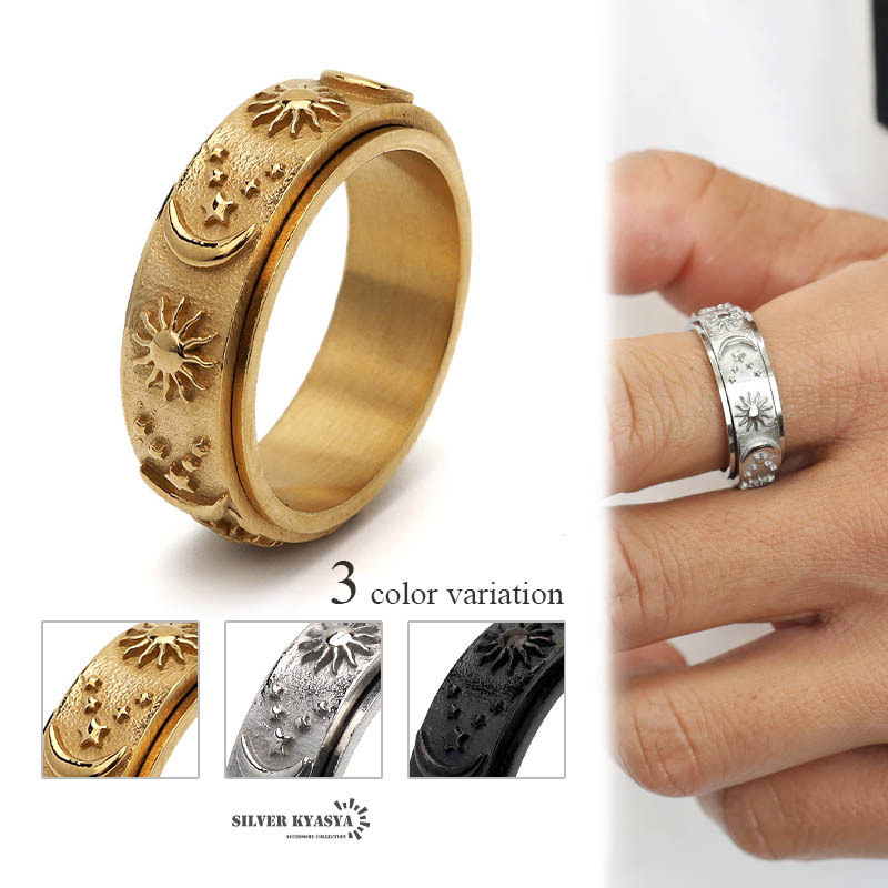 - (シルバー、22号) ボヘミアンリング ステンレス ギミックリング ゴールド シルバー ブラック 浮き彫り 太陽 つけっぱなしOK