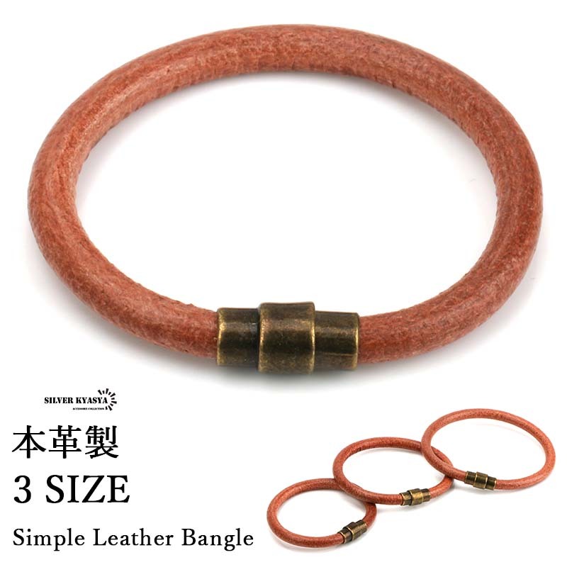 > (L-腕周り19cm) 本革 レザーバングル ブラウン ブレスレット 牛革 プレーンバングル 3サイズ 太め マグネット