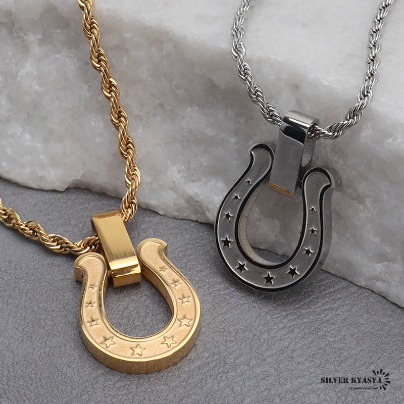 > (シルバー、50cm) ステンレス 馬蹄ネックレス ロープチェーン ゴールド シルバー ホースシューネックレス 金属アレルギー対応