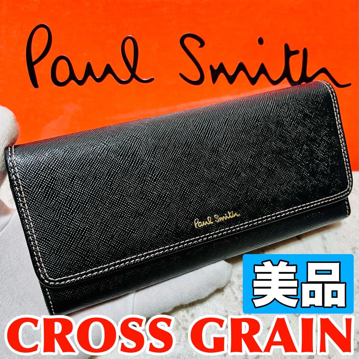 - 美品 ポールスミス PaulSmith クロスグレイン かぶせウォレット 長財布 ロングウォレット ブラック レディース メンズ PWW806 9046