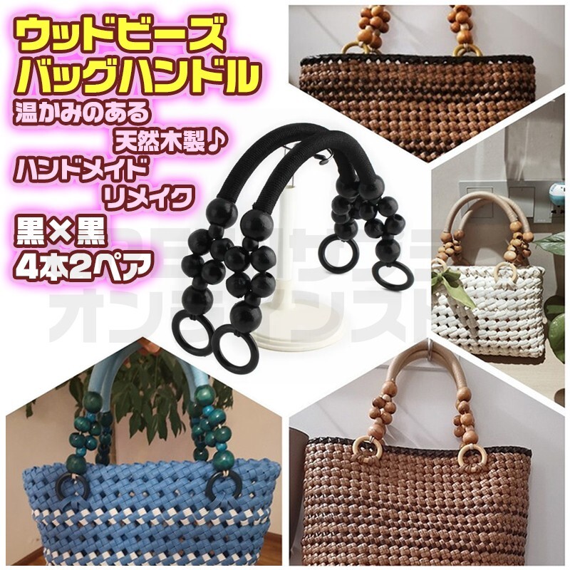 - バッグハンドル 交換用 持ち手 木製 ウッドビーズ 黒×黒 4個 2ペア