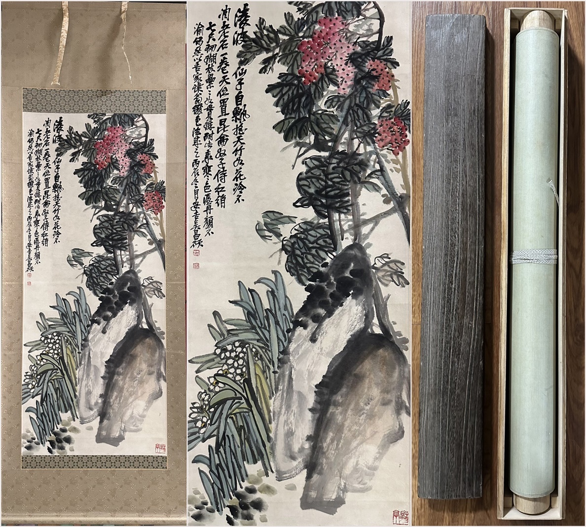 > 古美術 掛け軸 中国・近現代 「呉昌碩書」 紙本 【花卉図】 立軸 書道 巻き物 肉筆保証 唐物 古画 画心53x127cm LT-250230