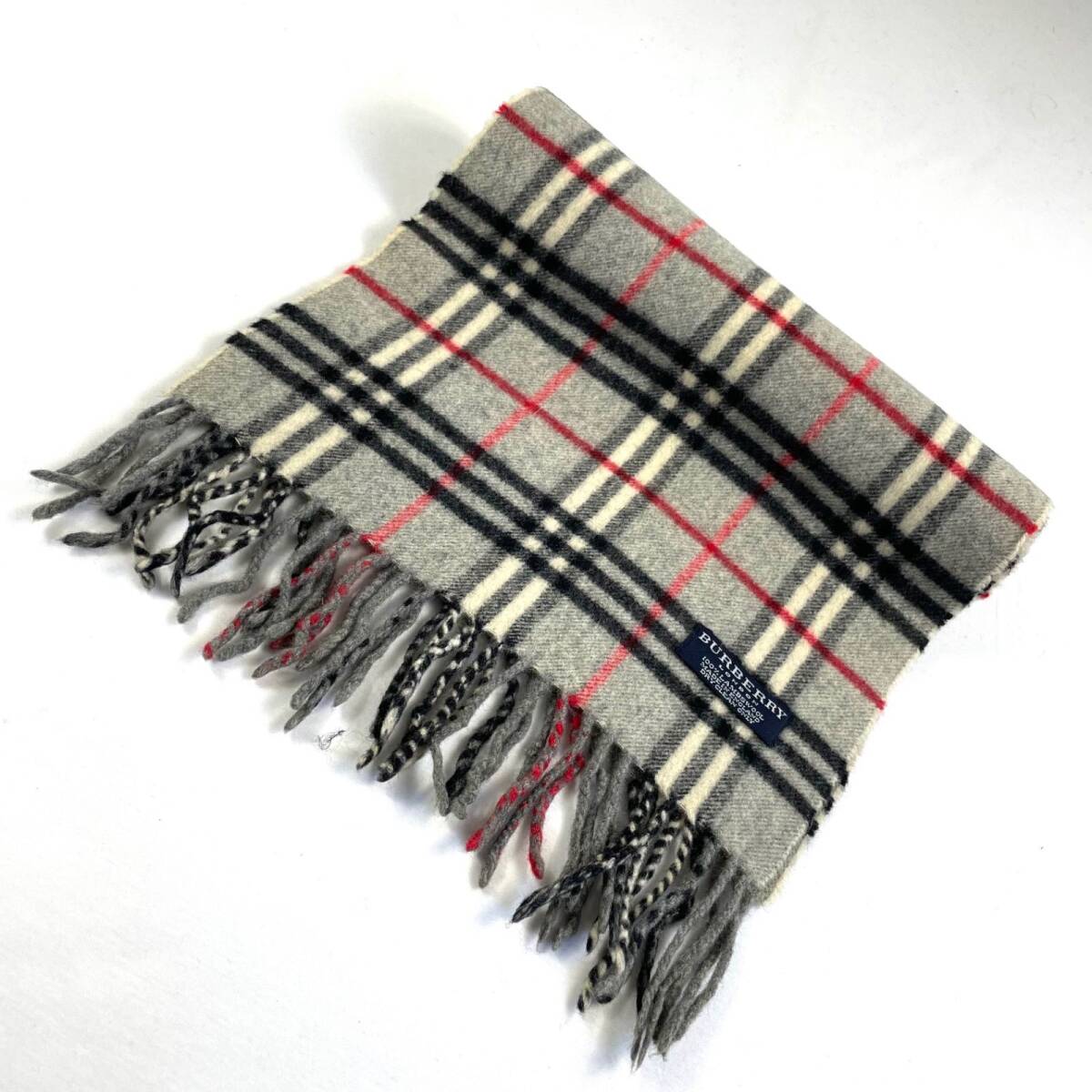 - t1522 バーバリーロンドン マフラー ラムズウール100% グレーノバチェックフリンジマフラー イギリス製 ユニセックス
