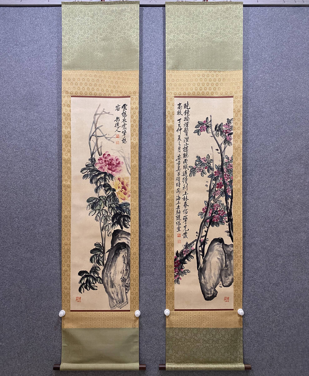 - 古美術 掛け軸 中国・近現代 「呉昌碩書」 紙本 【花卉図 雙軸】 立軸 書道 巻き物 肉筆保証 唐物 古画 画心122x34cm LT-250246