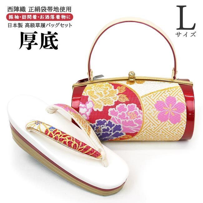 - Lサイズ 厚底 草履バッグセット 振袖用 zb-072 日本製 西陣織 帯地 ホワイト 白 ゴールド 金 赤 レッド 成人式