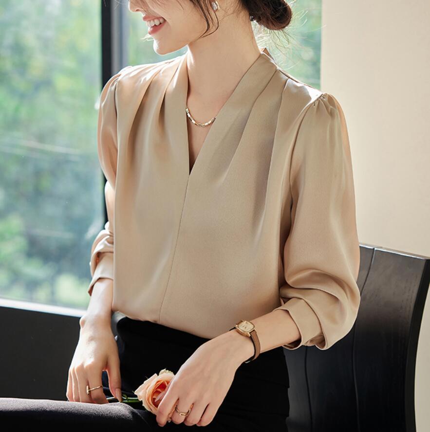 - 新品*ブラウス 長袖 レディース トップス Vネック サテン シャツブラウス tシャツ 高級感 フォーマル 卒園式 入園式 ブラウス *杏