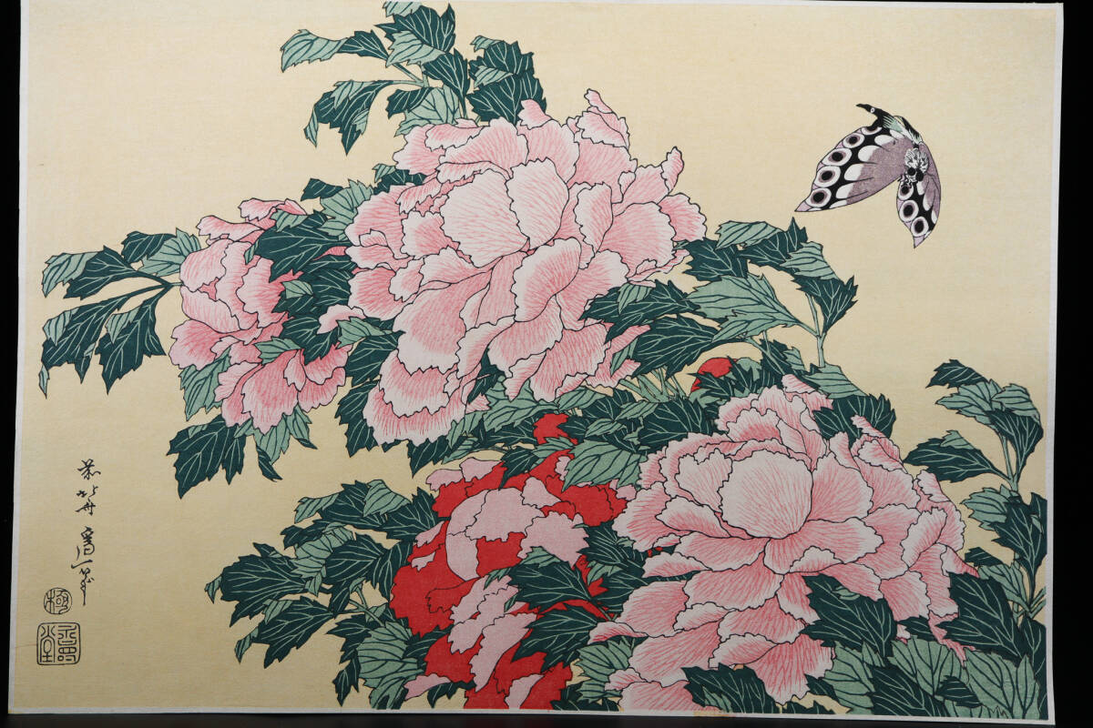 - ◇雅◇ 前北斎為一『牡丹と蝶』葛飾北斎 アダチ版画研究所 浮世絵木版画 浮世絵 錦絵 美人画 時代物 /FT.24.8[M19.95] OXT298