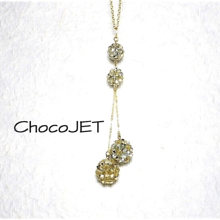 - ツインダブルビーズボールネックレス ゴールドシルバークリスタルチャーム 金色銀色丸玉くす玉