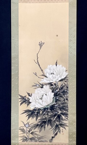 - SM4602[真作]小野智久牛「牡丹に蜂」掛軸 絹本 花鳥図 鳥獣 銀泥/伝統美術会主宰 川合玉堂に師事