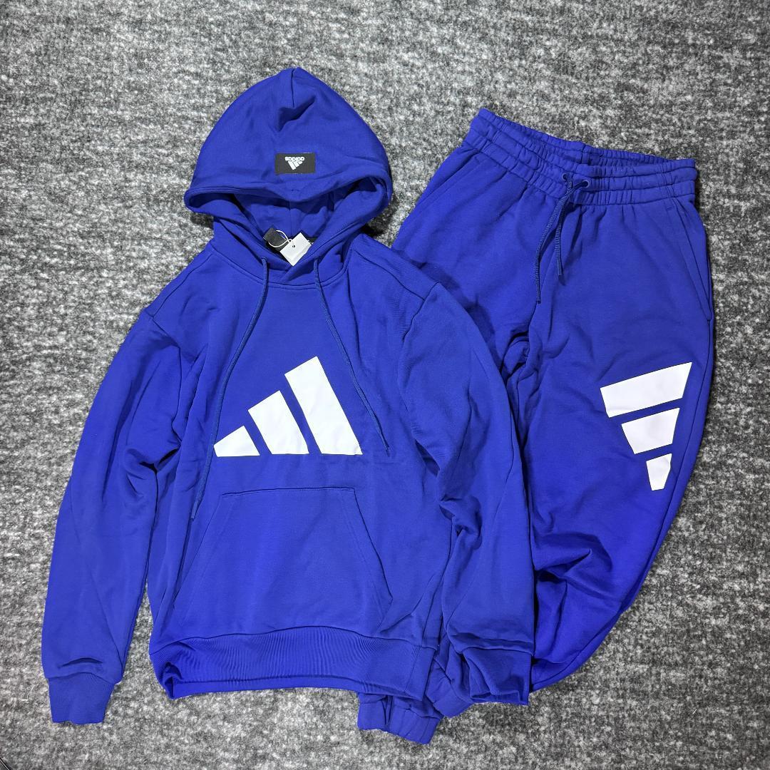 > 新品 Msize アディダス 上下セットアップ adidas スウェット プルオーバー パーカー パンツ プリント ビッグロゴ ネイビー 紺 人気柄