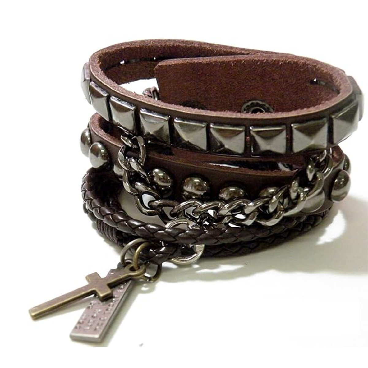 - 牛革 3連風 ブレスレット 編込みブレス 2本セット 男性用サイズ ブラウン brec-c3setbr