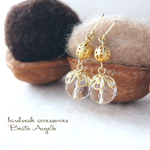 - ■+angelo+【高品質】天然石クリスタルと透かし玉のピアス(p-084)G 水晶 10mm 花座