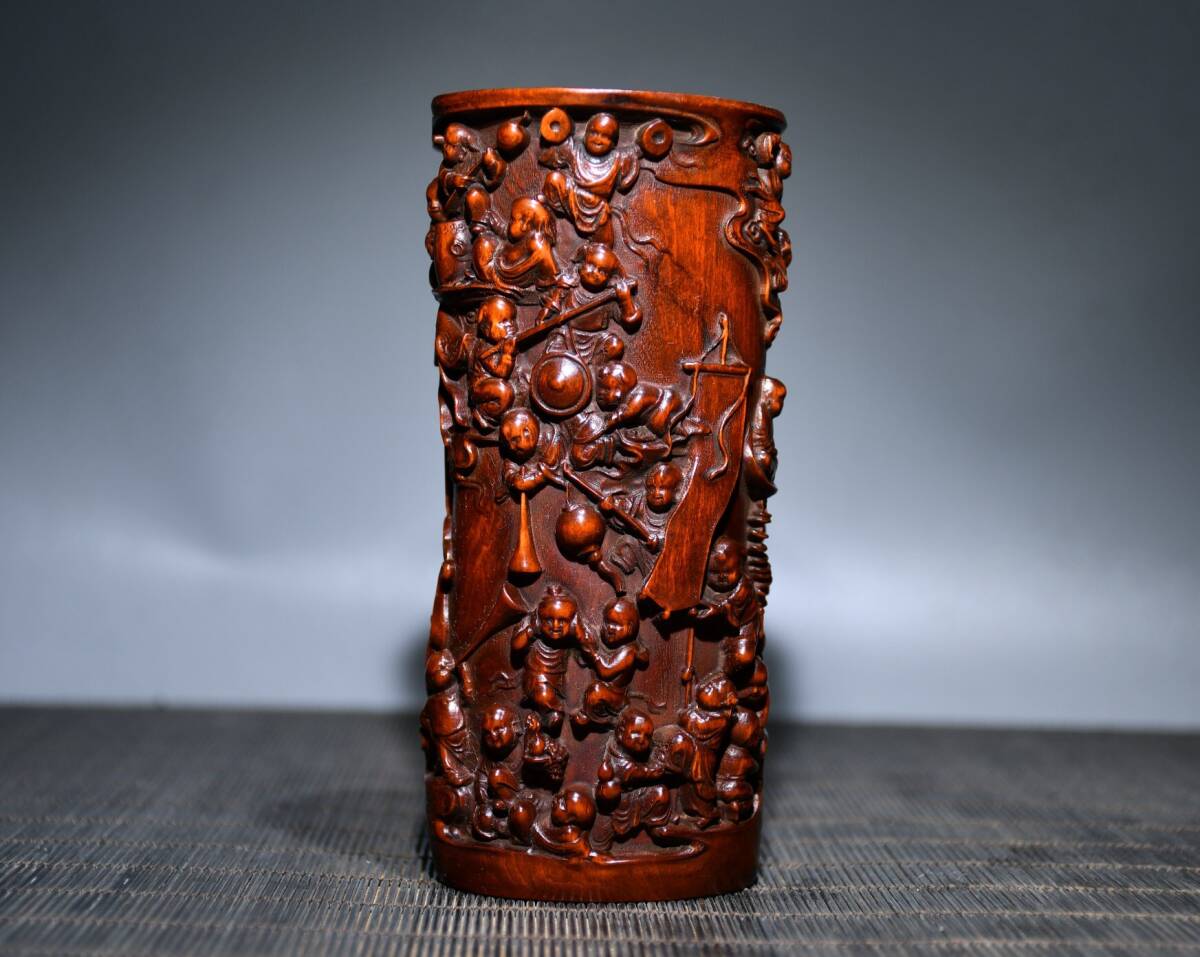- 【仁】『黄楊木製・細密彫・百子紋・筆筒・置物・賞物』極細工 古賞物 中国古玩 古美術 古美味