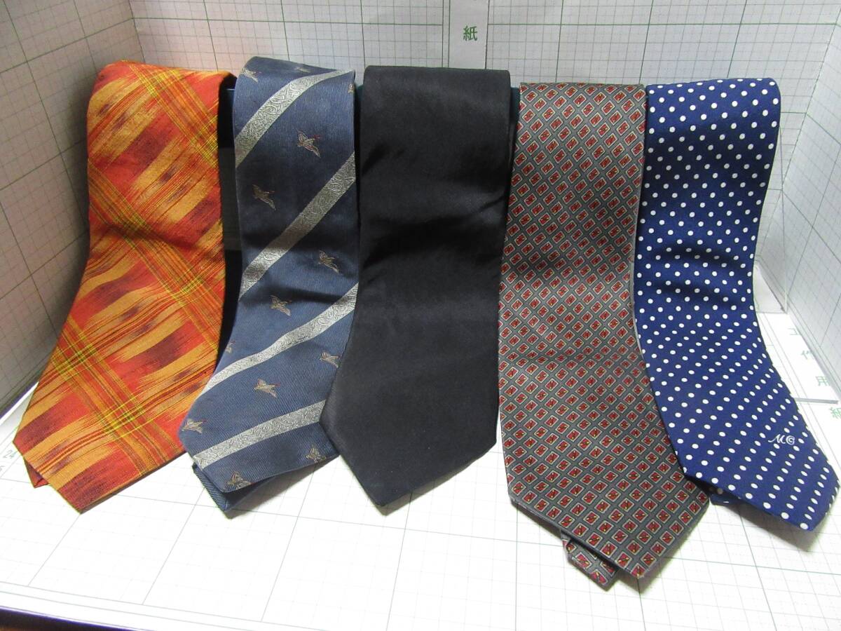 - 中古ネクタイ5本◆オレンジ色草木染、バーバリーネクタイ、仏事ネクタイ黒、茶と赤のネクタイ、MARY OLIVER 自宅保管I07
