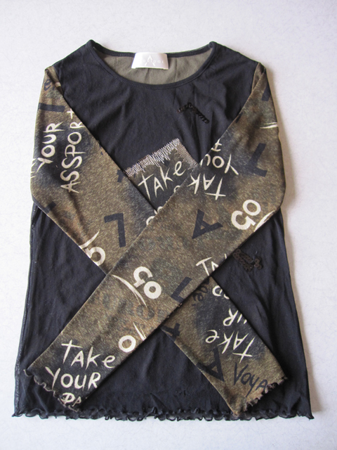 - ALDRIDGE アルドリッジ 薄手 カットソー ブラウス T シャツ レディース イタリア製 黒×茶系 英文字柄 スパンコール 刺繍 アップリケ