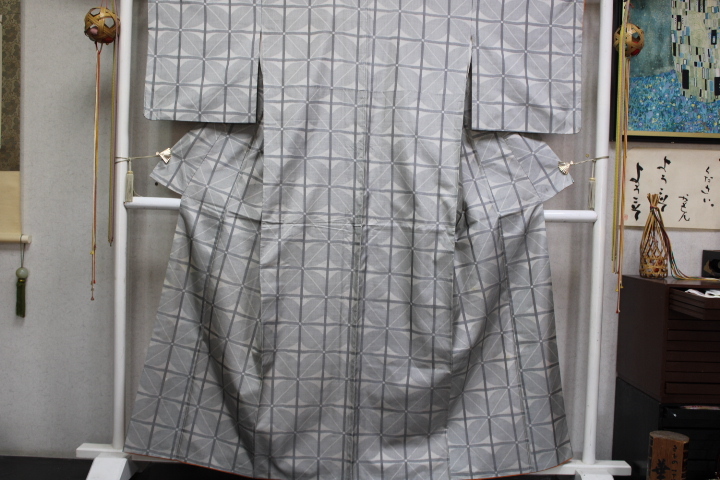 > きもの今昔8263 紬のきもの 広衿袷手縫い仕立 十日町手織り大島調グレー格子柄 未使用に近い 身丈159cm