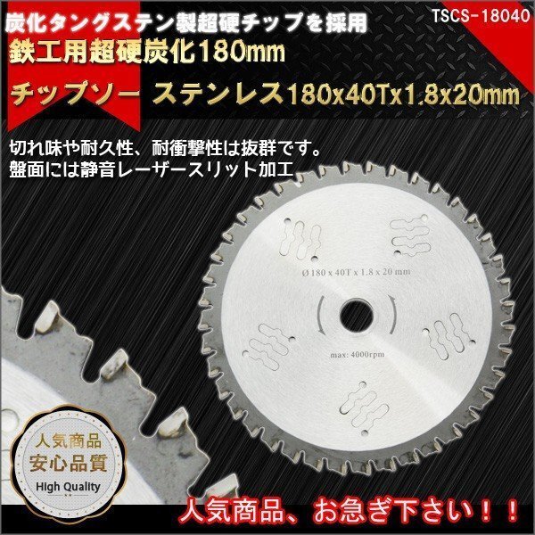 > ★送料無料★静音加工!チップソー 鉄工用 内径20mm 超硬炭化タングステン 鉄 ステンレス 切れ味 耐久性レーザースリット 180mm 40T