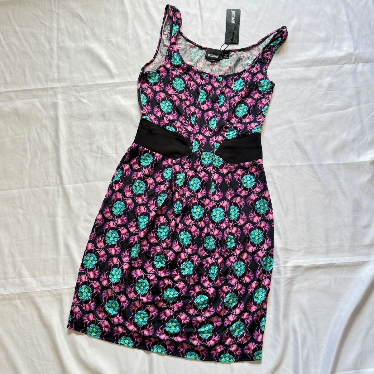 - 【未使用 タグ付き】ジャストカヴァリ ワンピース ノースリーブ 総柄 S