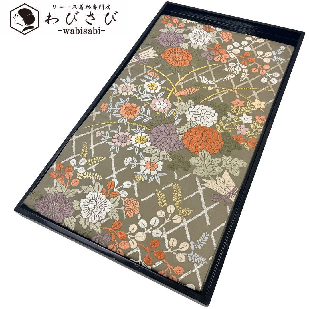 > 袋帯 唐織 竹柵に花柄模様 金銀糸 麹塵色 O-4750 着物 きもの kimono 和服 和装 中古 リサイクル着物 【送料無料】