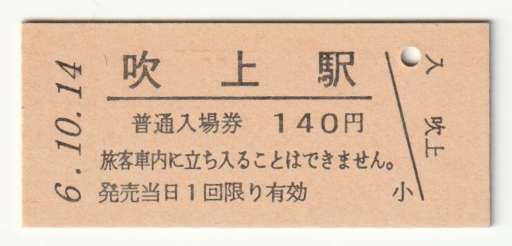 - 平成6年10月14日 高崎線 吹上駅 140円硬券普通入場券(日付印刷)