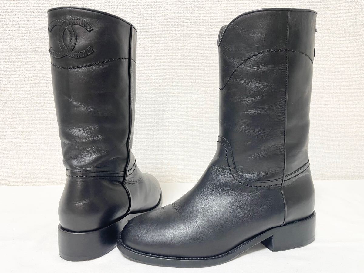- 【正規品】美品 シャネル CHANEL G26068 ココマーク ステッチ レザー ウッドソール ウエスタン ショート ブーツ レディース シューズ 靴 36
