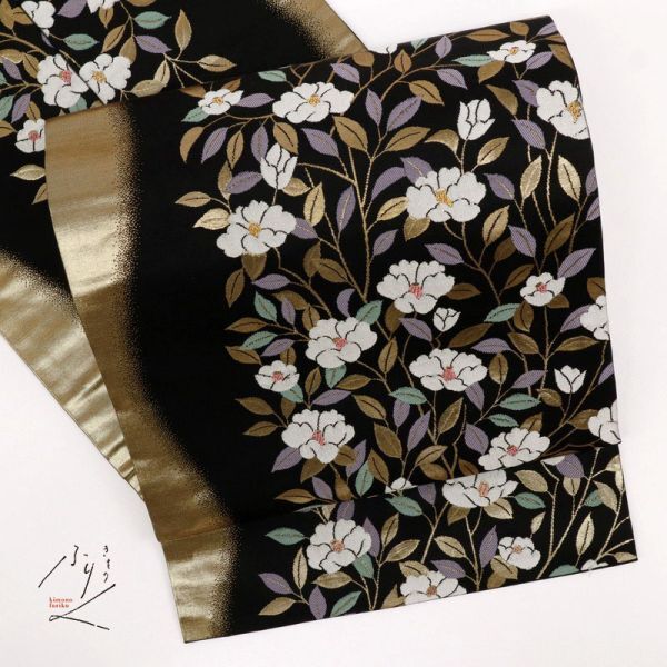 > 【名古屋帯】 煌びやか曲線にサザンカの花模様 黒 正絹着物 NB11-8