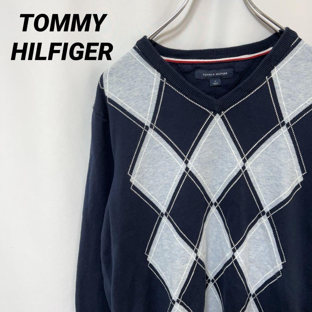 > N-3190 トミーヒルフィガー 古着 アーガイルニット Vネック コットン M