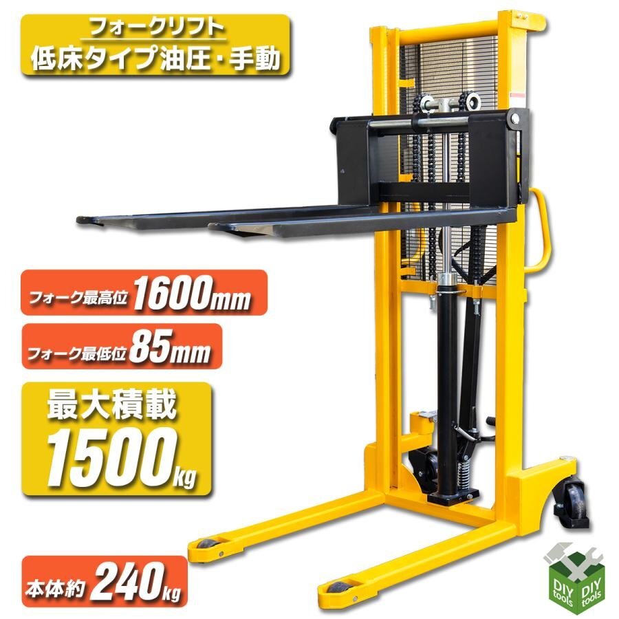 > 1.5tフォークリフト 低床タイプ油圧・手動兼用 ハンドフォークリフト(最大積載1500kg)ハンドリフト 免許不要【営業店止め】※再入荷