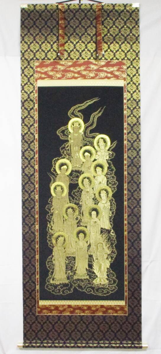 - 《ジャムルK》 khc0122-88◆◆ 掛軸 十三佛 十三代目六文字屋半兵衛作 本金正絹西陣織 保証書 純金平箔 分析通知書付 共箱 二重箱