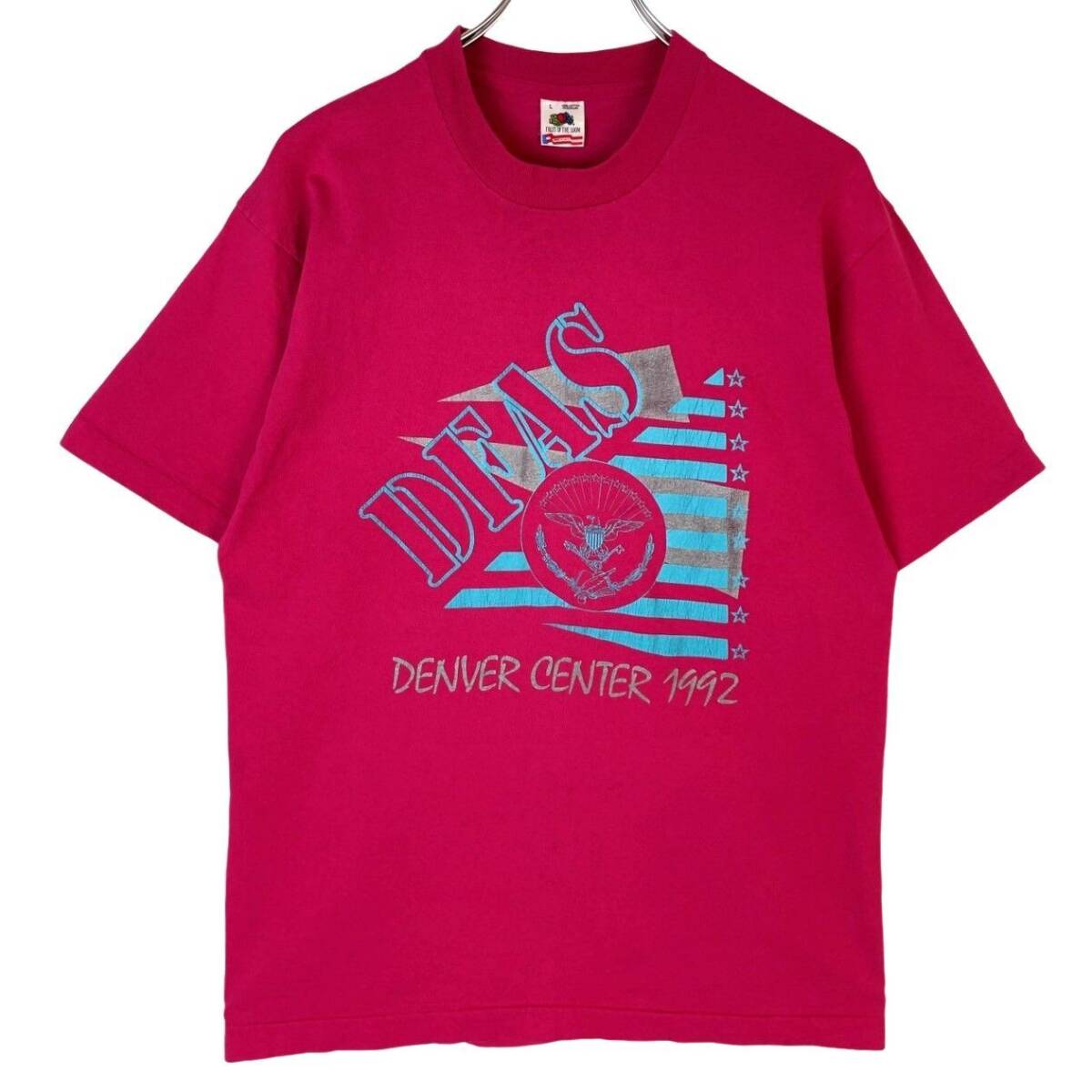 > 90sUSA製フルーツオブザルームFruit of the loom半袖Tシャツ袖シングルステッチDFASアメリカ国防予算経理局ロゴプリント紋章ピンク40620