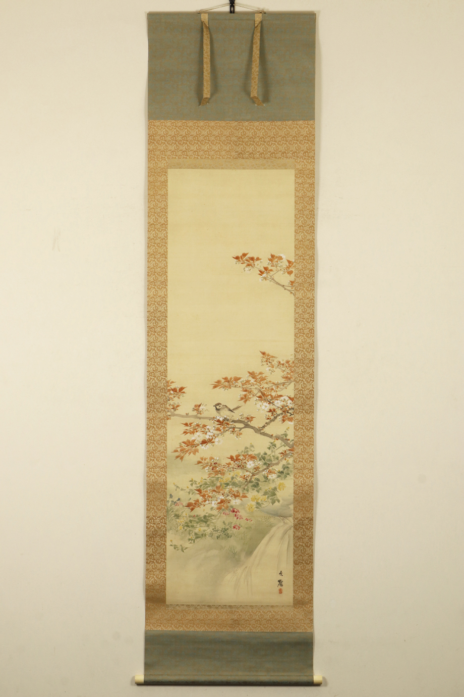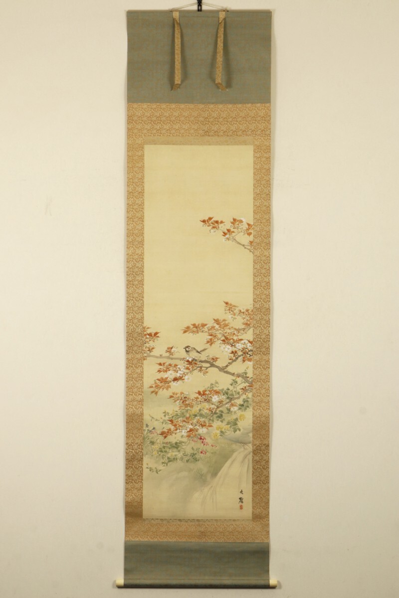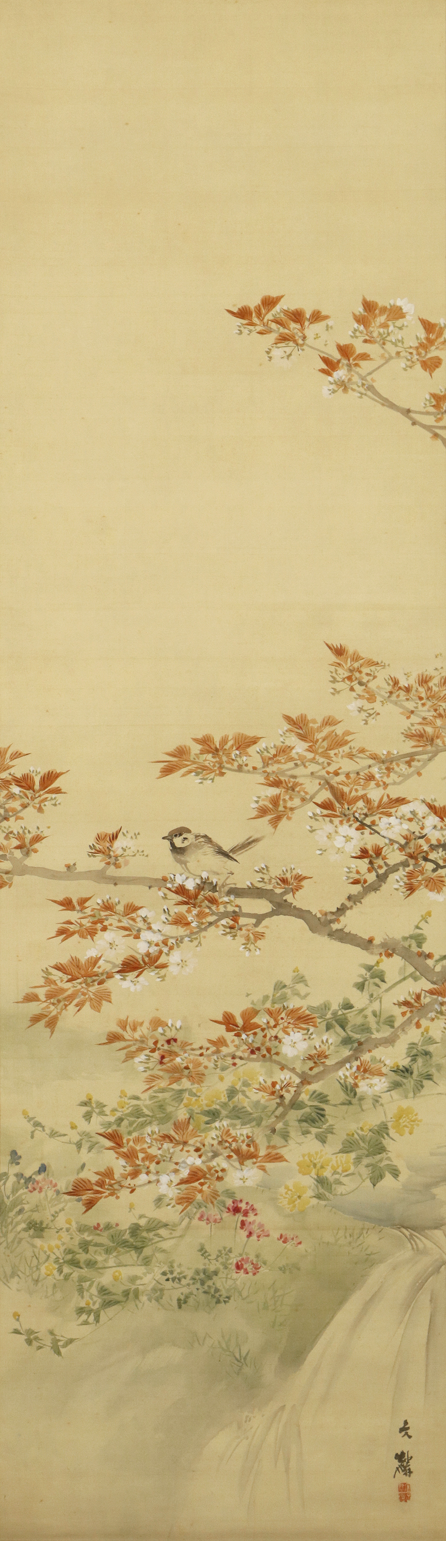 - 【真作】掛軸「塩川文麟 桜ニ雀之図」幕末明治 画家 四条派 岡本豊彦門下 如雲社 近代京都画壇基礎 動物画 絵画