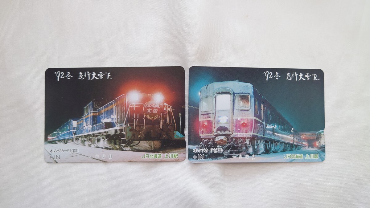 - ●JR北海道 上川駅●'92冬 急行大雪●記念オレンジカード未使用2枚一括 国鉄 夜行急行 14系客車 DD51