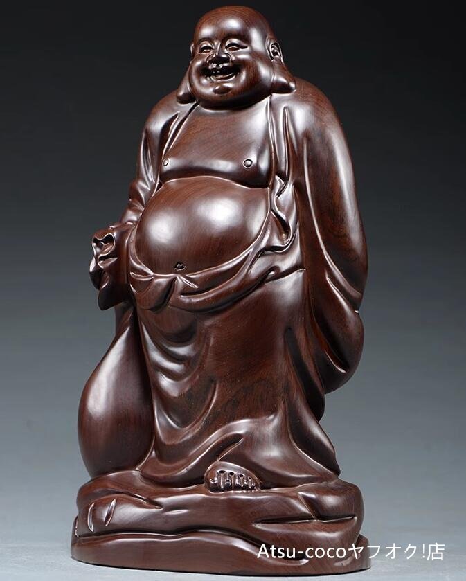- 仏教美術 細密彫刻 弥勒仏 笑う仏陀 木彫仏像 木像 黒檀 ケース付 48cm